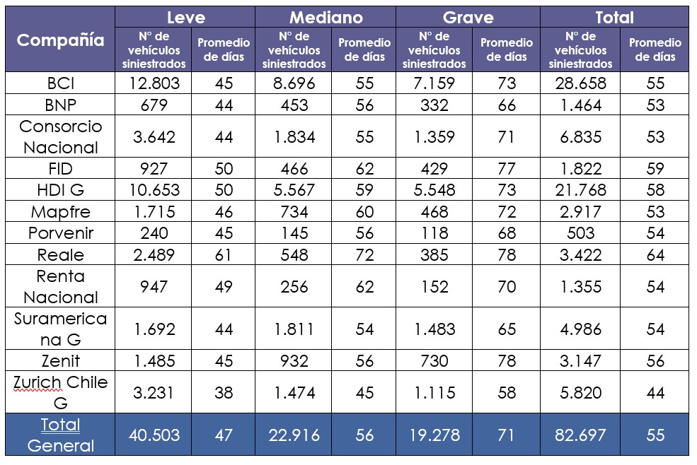 Por otro lado, la CMF suele entregar un cuadro con el detalle por aseguradoras. Con la información disponible y compartida a la fecha de esta nota, la compañía de seguros automotrices “más rápida” es Zurich, con 44 días en promedio entre que se denuncia un siniestro hasta que el vehículo queda listo.