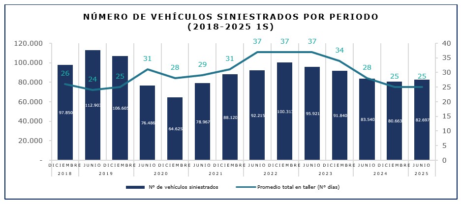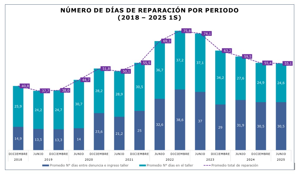 A comparación de la primera mitad del 2024 (60 días), la reparación de un vehículo siniestrado se ha vuelto más ágil, con cinco días más rápido en promedio.